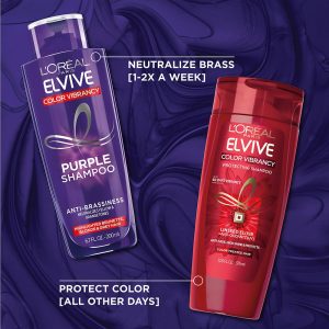 Have you ever noticed your hair color change a few weeks after coloring? Your hair might start to take on an undesired yellow or orange tone. This is referred to as brass – the appearance of unwanted warm tones in color treated hair. Say no to brass with Elvive Color Vibrancy Purple. Our color correcting formula is enriched with purple pigments to neutralize brass and help keep color vibrant in between colorings. Say no to brass. Go Purple.
