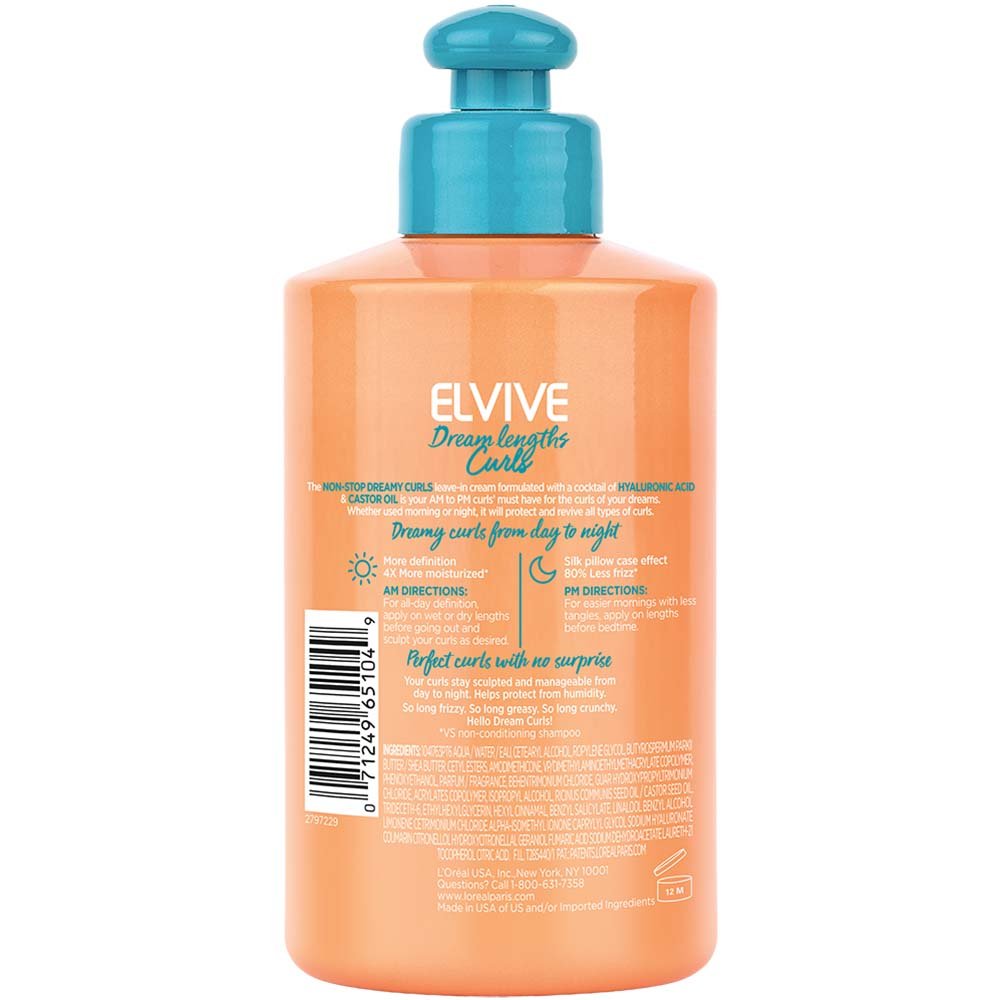 Elvive Dream Lengths Curls paraben-free nourishing formulas help you achieve dreamy hydrated, defined, bouncy, soft curly hair without weigh down. Formulated with a cocktail of hyaluronic acid and fine castor oil, Elvive Dream Lengths Curls curly hair regimen helps locks in long-lasting moisture for deeply hydrated curly hair from scalp to tip and defines curly hair by sculpting and retaining shape. Plus, it helps fight humidity!