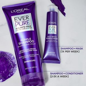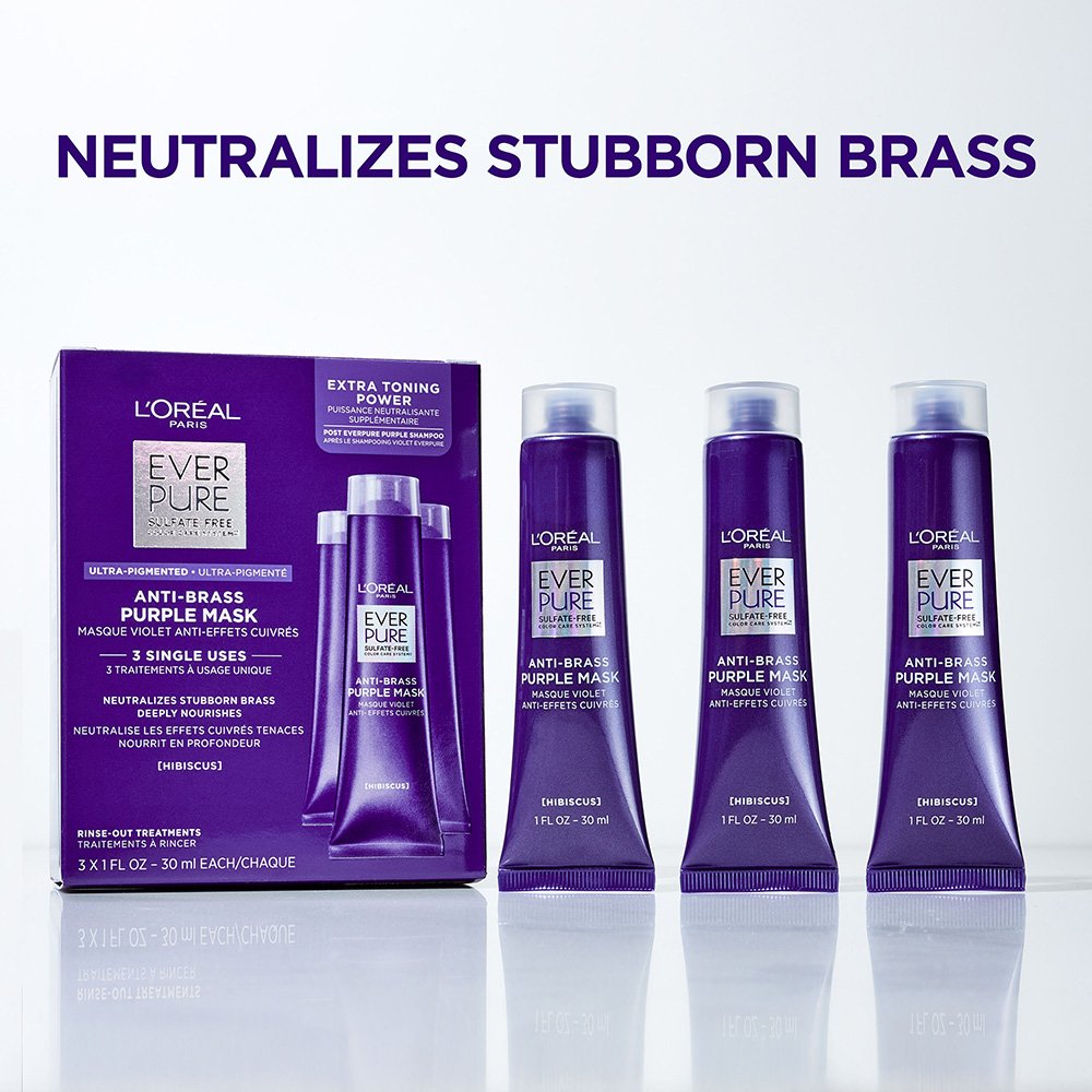 Your beautiful blonde colored, bleached, or highlighted hair can turn brassy over time. Our EverPure Sulfate-Free Anti-Brass Purple Mask with hibiscus neutralizes stubborn brass and deeply nourishes hair for your brightest blonde in just 5 minutes. Blonde color-treated hair requires special care. Formulated with even more toning pigments than our purple shampoo and 100% free of sulfates, parabens, harsh salts and surfactants, our intense mask treatment helps correct your color without stripping your hair. Experience a rich, creamy texture, easy application, and powerful results in just 5 minutes! Because you’re worth it!