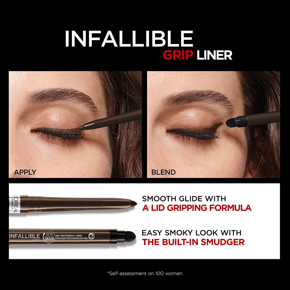 Infallible Grip Mechanical Gel Eyeliner defines your eyes with vibrant gel color that lasts up to 36 hours. The pointed tip glides effortlessly across the skin without skipping or dragging to create bold or classic eyeliner looks. The 8, highly-pigmented shades, are: