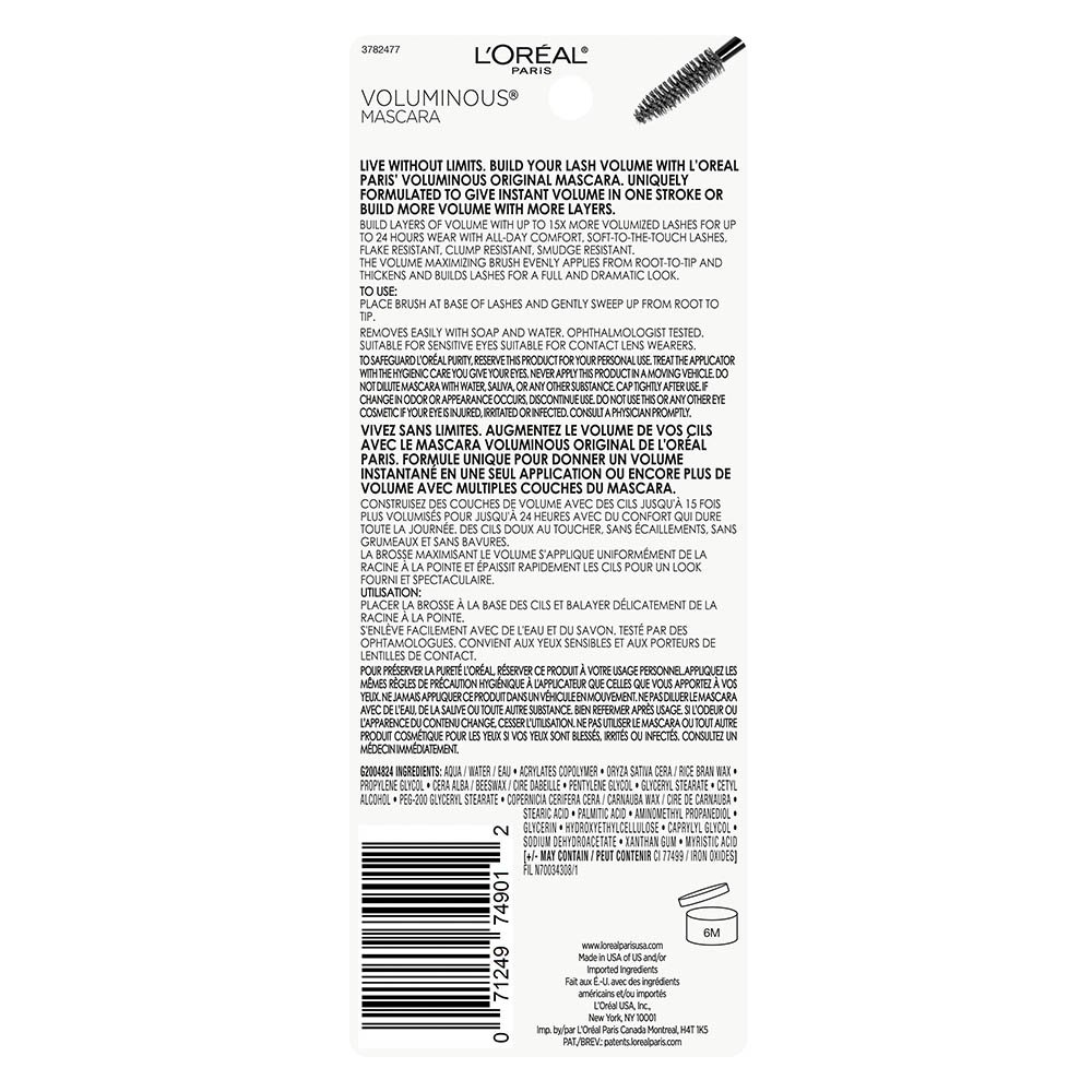 L’Oréal Paris Voluminous Original Volume Building Mascara is uniquely formulated to resist clumping, keep lashes soft, and build lashes up to 5x their natural thickness. Volume Maximizing Brush quickly thickens and builds lashes evenly for a full and bold look. Contains Panthenol and Ceramide-R and helps protect and condition lashes. Resists clumping and flaking, and leaves lashes supple and soft to the touch.